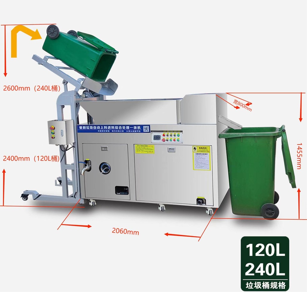 餐飲垃圾處理產品,是機關食堂必備,利用機械提升,將垃圾桶倒扣入設備進料斗。